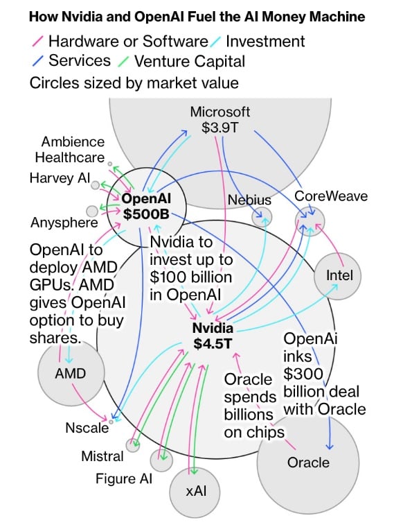 Oracle, заключыўшая з OpenAI кантракт на $300 мільярдаў на будаўніцтва дата-цэнтраў у ЗША, у сваю чаргу закупляе чыпы Nvidia на $40 мільярдаў для гэтых жа аб’ектаў, вяртаючы сродкі зноў да галоўнага пастаўшчыка вылічальных магутнасцяў. Паралельна Nvidia пашырае свае інвестыцыі ў стартапы, уключаючы кампанію Ілана Маска xAI і воблачнага правайдера CoreWeave, які арандуе і перапрадае вылічальныя магутнасці Nvidia.
