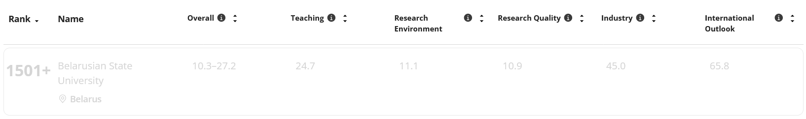 У спіс уключана 2191 навучальная ўстанова са 115 краін і тэрыторый. БДУ можна знайсці на 1501-м месцы (якое ён падзяляе з іншымі), але тэкст выдзелены шэрым колерам, а профіль універсітэта на сайце арганізацыі недаступны.