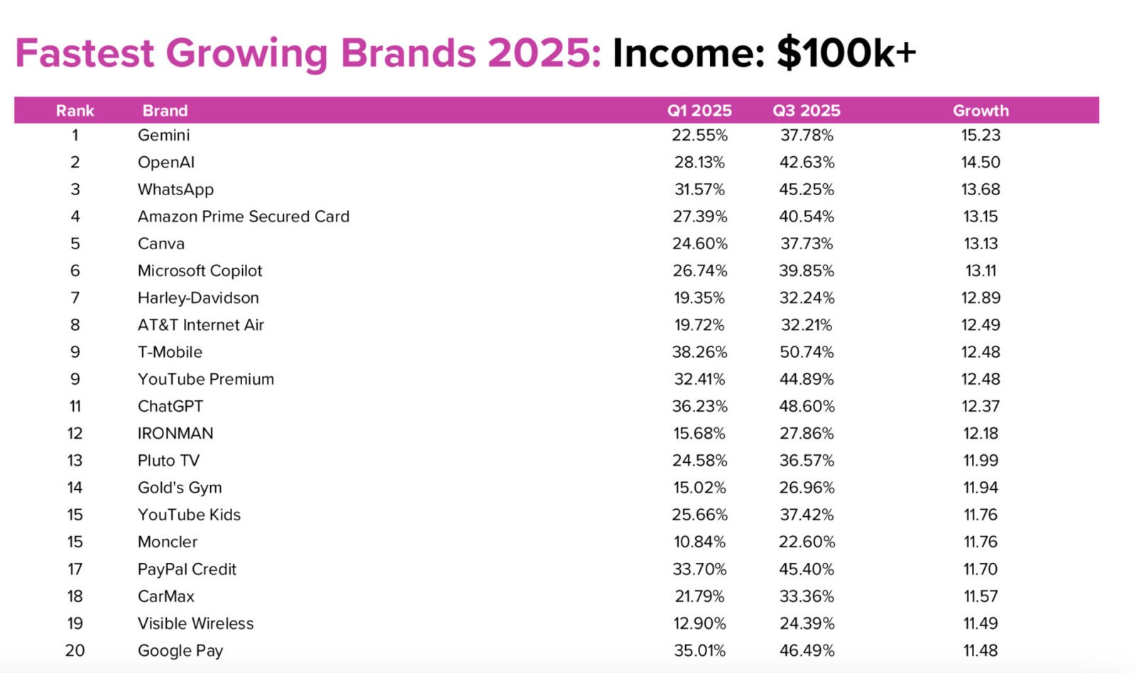 Цікавасць да ШІ расце ва ўсіх групах, але сярод забяспечаных карыстальнікаў ён стаў «выбуховым». Пазнавальнасць Gemini сярод людзей з даходам вышэй за $100 тысяч дасягнула 78% да канца трэцяга квартала — супраць 62% у пачатку года, што робіць яго адным з самых хуткарослых чат-ботаў.