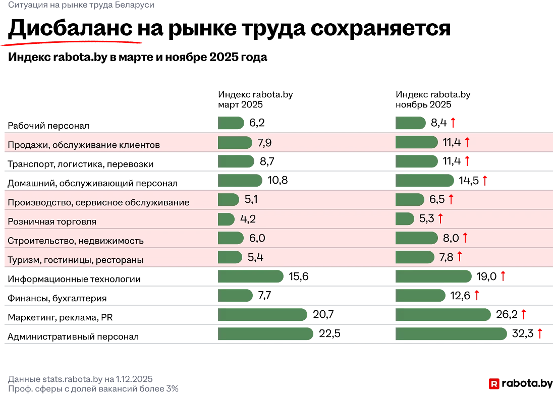 Па словах Святланы, 2025 год быў актыўным і зменлівым. З восені 2024-га і да гэтага часу ўзмацняецца канкурэнцыя сярод саіскальнікаў: да канца 2025-га колькасць рэзюмэ павялічылася на 72,3%, а колькасць вакансій знізілася на 3,8%. У сярэднім па рынку на 1 вакансію на сайце прыходзіцца 11 рэзюмэ — нормай лічыцца 6-8 рэзюмэ. Пры гэтым у некаторых галінах кандыдатаў наадварот не хапае.