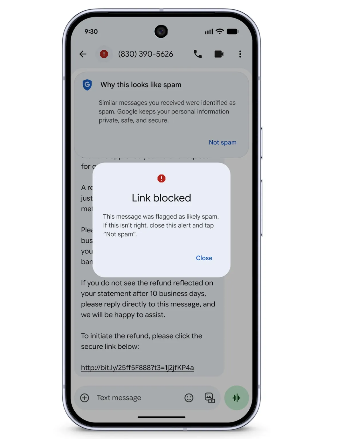 Акрамя таго, Google укараняе сістэму выяўлення падазроных спасылак у аплікацыі Messages. Цяпер пры спробе перайсці па шкоднай ці сумніўнай спасылцы аплікацыя папярэдзіць карыстальніка і заблакуе пераход.