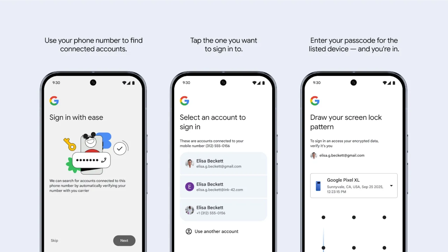 Google таксама дадала магчымасць уваходу з дапамогай нумара тэлефона. Калі прылада згублена, Google аўтаматычна знаходзіць усе звязаныя з нумарам акаўнты. Для пацвярджэння асобы можна выкарыстоўваць код ці шаблон блакіроўкі з папярэдняй прылады. Гэтая функцыя ўжо пачала паступова распаўсюджвацца па ўсім свеце.