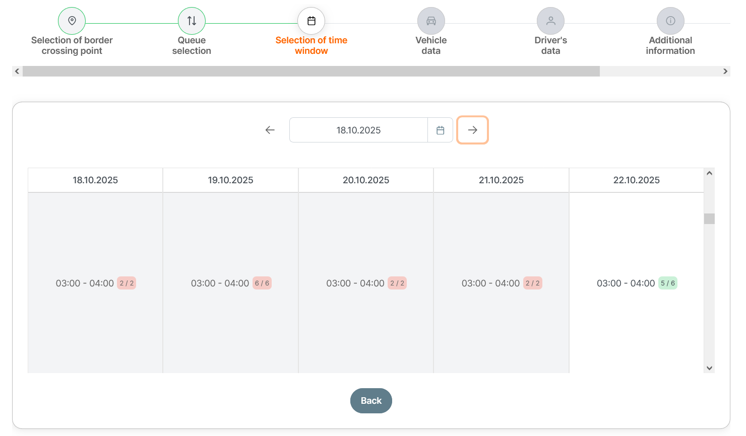 Бліжэйшае даступнае акно для браніравання — 3-4 гадзіны раніцы 22 кастрычніка. Сістэма сцвярджае, што ўсе астатнія слоты разабраны. Пры гэтым, згодна з сайтам Дзяржпагранкамітэта, з 2 гадзін ночы 29 верасня ў чарзе на выезд у Латвію праз Грыгароўшчыну няма ні легкавушак, ні аўтобусаў.