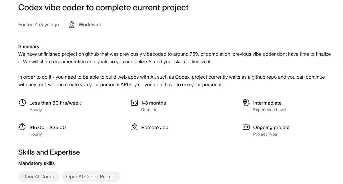 Вакансія абвяшчае: «У нас ёсць незавершаны праект на GitHub, які быў даведзены пры дапамозе вайб-кодынгу прыкладна да 75% гатоўнасці. У мінулага вайб-кодэра няма часу дарабіць яго. Мы прадаставім дакументацыю і мэты, каб вы маглі выкарыстоўваць ШІ і свае навыкі для завяршэння працы». Асабліва забаўна, што выканаўцу прапануюць стварыць персанальны API-ключ, каб той не марнаваў свой.