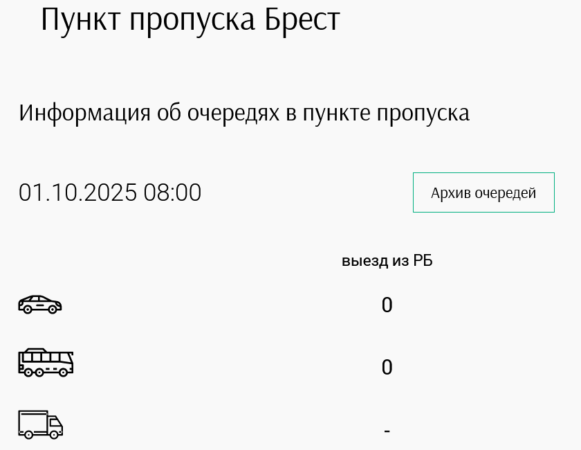 Паводле звестак ДМК, да 8 гадзін раніцы ў пункце пропуску «Брэст» у чарзе на выезд з Беларусі ў Польшчу не было ні легкавушак, ні аўтобусаў. У абедзвюх графах — па нулях.