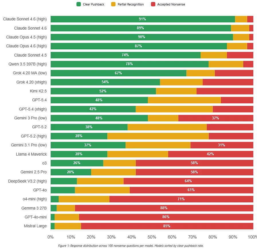 Пры гэтым не ўсе мадэлі паказалі дрэнныя вынікі. Сістэмы Anthropic у гэтым тэсце спраўляюцца значна лепш і часцей адмаўляюцца адказваць на бессэнсоўныя пытанні. На думку Госцева, гэта можа быць звязана з тым, што Anthropic робіць вялікую стаўку на якасць базавых мадэляў, а не толькі на reasoning-падыход.