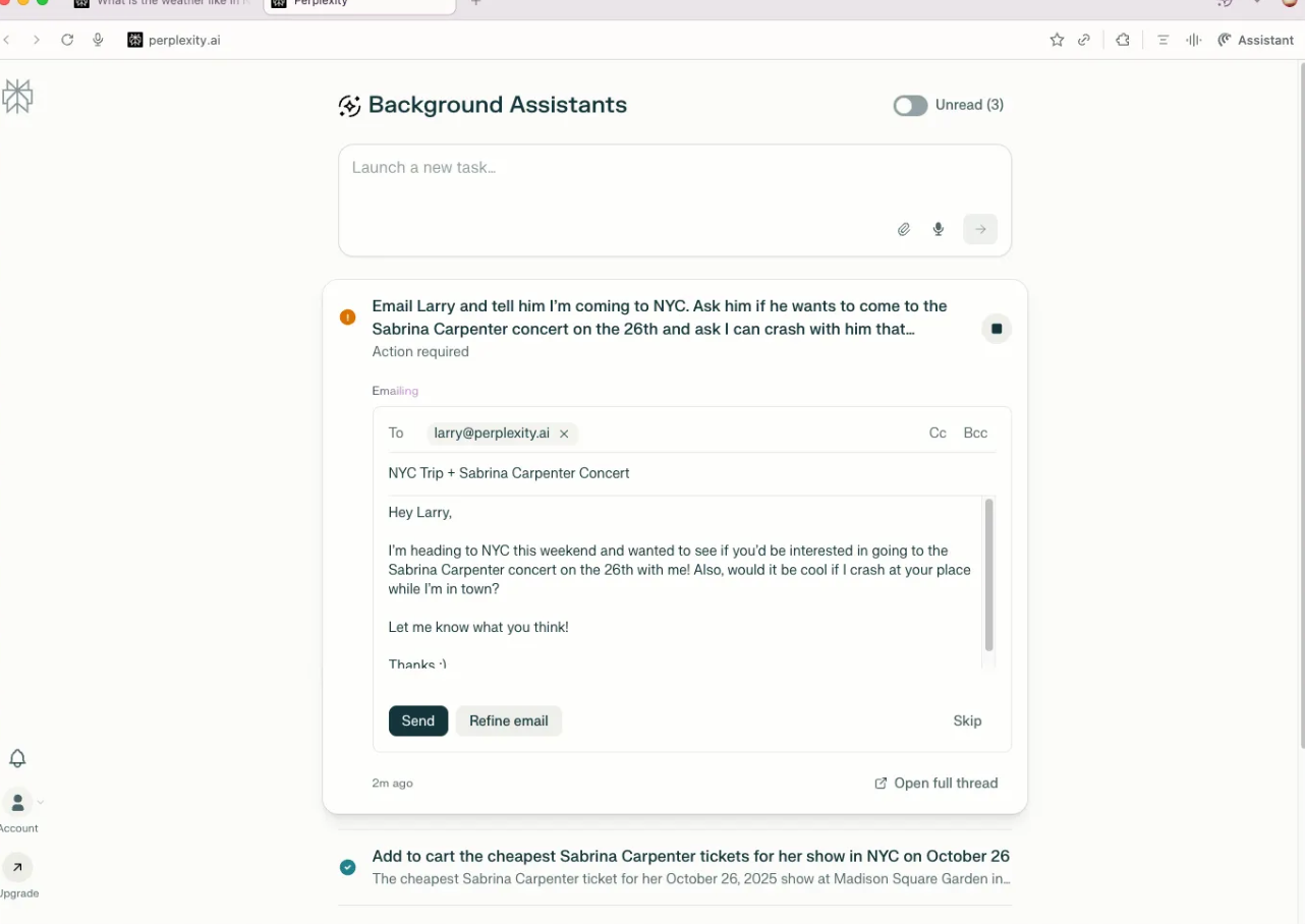 Карыстальнік можа даручыць асістэнту адпраўку лістоў, пошук і браніраванне квіткоў ці афармленне анлайн-пакупак, пакуль ён сам займаецца іншымі справамі. Асістэнт працуе праз адзіную панэль кіравання і апавяшчае аб завяршэнні задач.