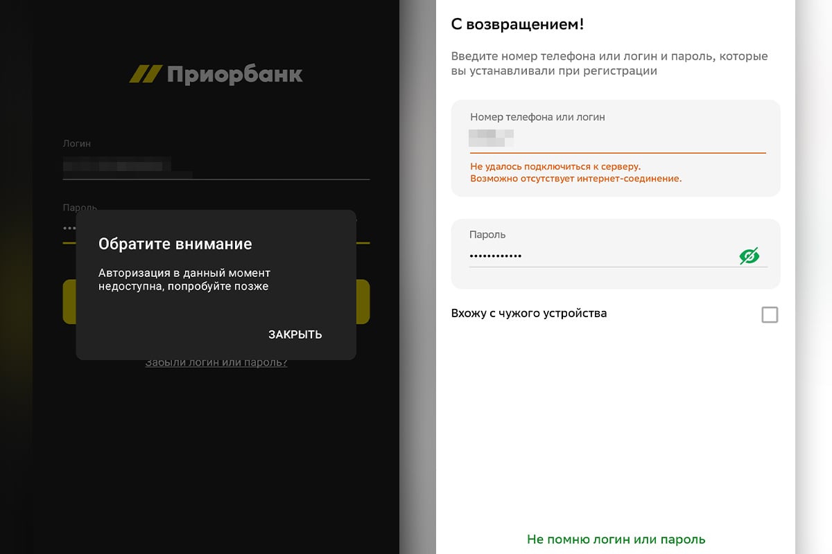 У кліентаў Сбера не атрымліваецца ўвайсці ў акаўнты праз мабільную аплікацыю і праз сайт — адлюстроўваецца збой у сетцы альбо сэрвіс часова недаступны. Банкаўскі чат-бот кажа, што недаступны «з-за высокай нагрузкі на Цэнтр кліенцкай падтрымкі». Карыстальнікі Прыёрбанка пры спробе ўвайсці ў праграму бачаць паведамленне пра тое, што аўтарызацыя недаступная.
