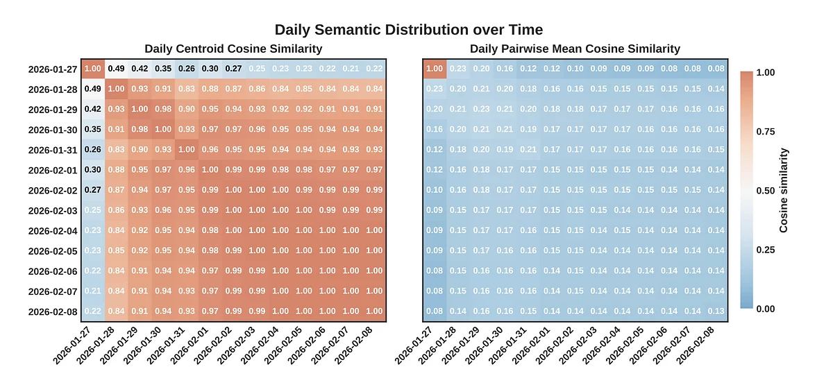 Дынаміка сэнсавага падабенства публікацый на Moltbook. Злева паказана, што агульная тэматычная накіраванасць кантэнту па днях хутка стабілізуецца і застаецца высокай. Справа бачна, што асобныя посты паміж сабой застаюцца слаба падобнымі. Гэта азначае, што ў платформы фарміруецца агульны «фон» тэм, але асобныя агенты не збліжаюцца па змесце. Крыніца: Li et al.