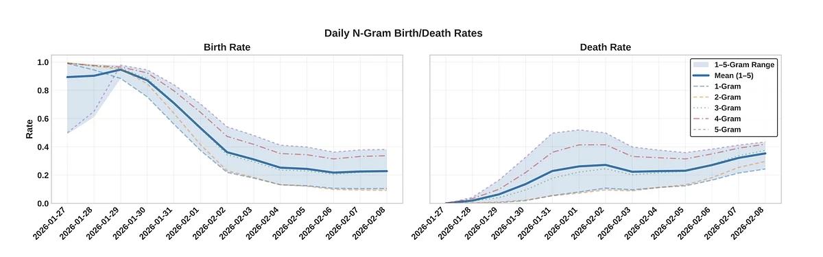 Сутачная дынаміка з’яўлення і знікнення новых словазлучэнняў (1–5 слоў) на платформе Moltbook. Пасля першапачатковага ўсплёску новыя выразы з’яўляюцца радзей, але і не знікаюць цалкам. Паказчыкі не апускаюцца да нуля, што сведчыць аб пастаянным абнаўленні слоўніка без фарміравання ўстойлівага набору тэм. Крыніца: Li et al.