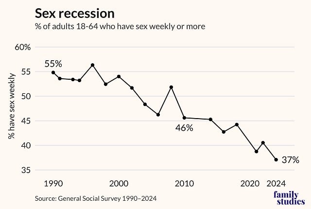 Калі ў 1990 годзе пра інтымную блізкасць хаця б раз на тыдзень паведамляла 55% апытаных ва ўзросце ад 18 да 64 гадоў, то ў 2024 штотыднёвы або больш часты секс быў толькі ў 37% жыхароў ЗША.