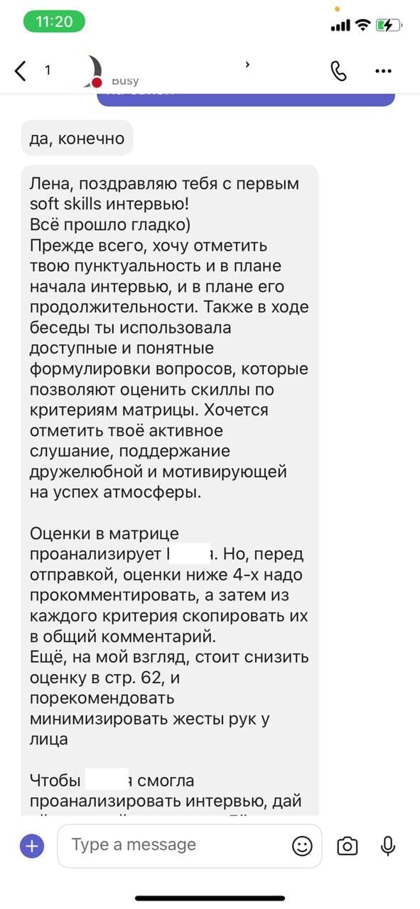 В тот день она ещё провела рабочие созвоны. А поздно вечером ей позвонили из Andersen. На этом созвоне, по её словам, компетенции поставили под сомнение. Например, утверждали, что Елена недостаточно владеет английским языком.