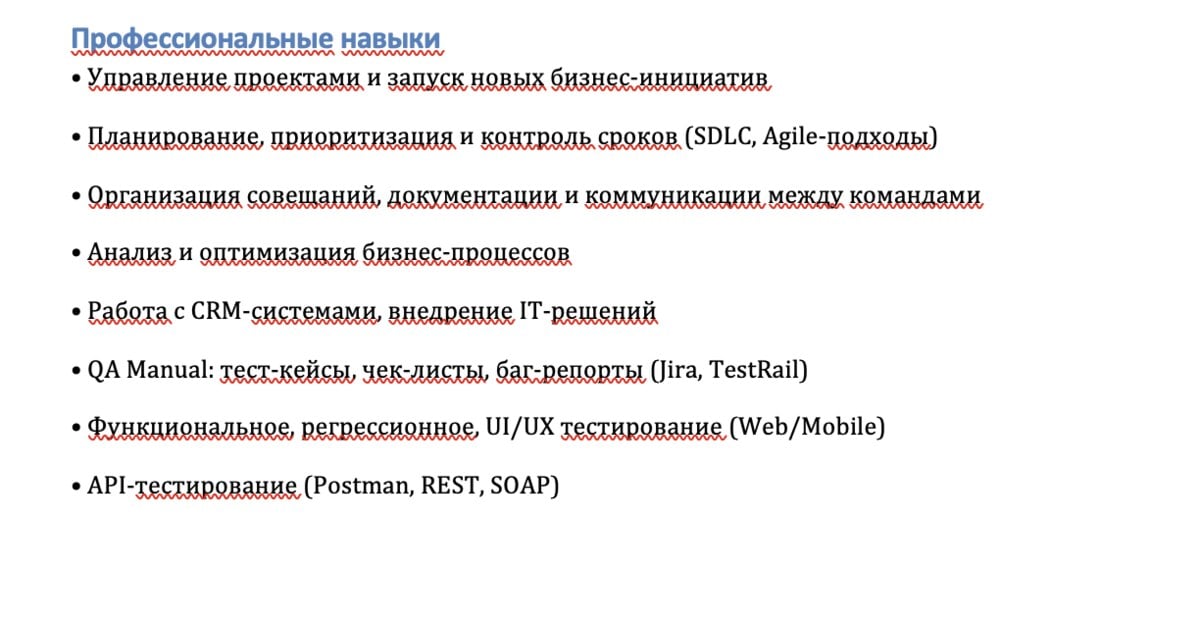 В резюме появились ИТ-инструменты: опыт работы с мануальным тестированием, управление проектами, работа с SQL (язык запросов для управления и взаимодействия с реляционными базами данных). Но это снова сбивает меня с толку: такие навыки немного противоречат разделу Summary, не подтверждаются опытом работы и просто «висят» в списке. Возникает вопрос: зачем они здесь?