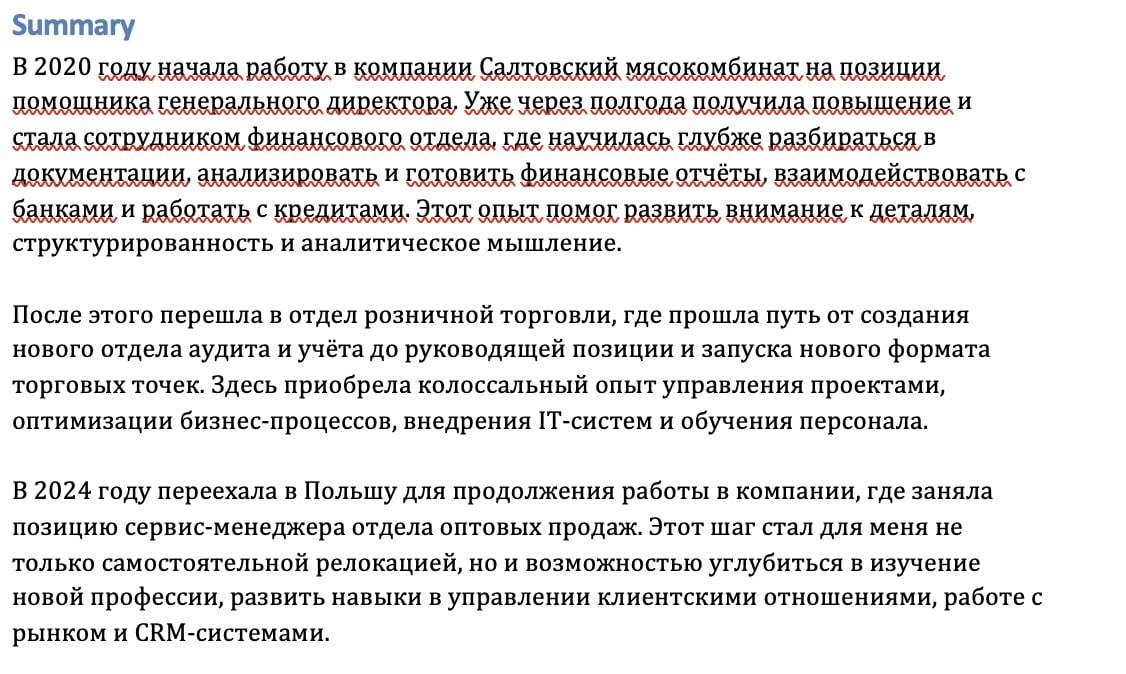 К чему я веду: важно в резюме помимо описания опыта чётко обозначать желаемую должность. То есть на кого вы откликаетесь и кем себя видите в ближайшей перспективе. Из поля «Summary» в резюме Анастасии я поняла общее направление и карьерный путь, но могу только предположить, какую роль она рассматривает для себя: бухгалтера, финансового менеджера или менеджера по продажам?