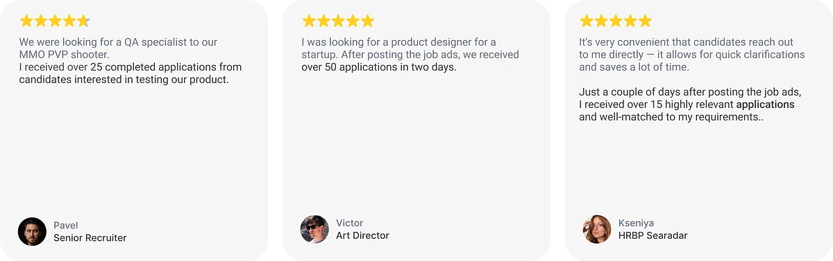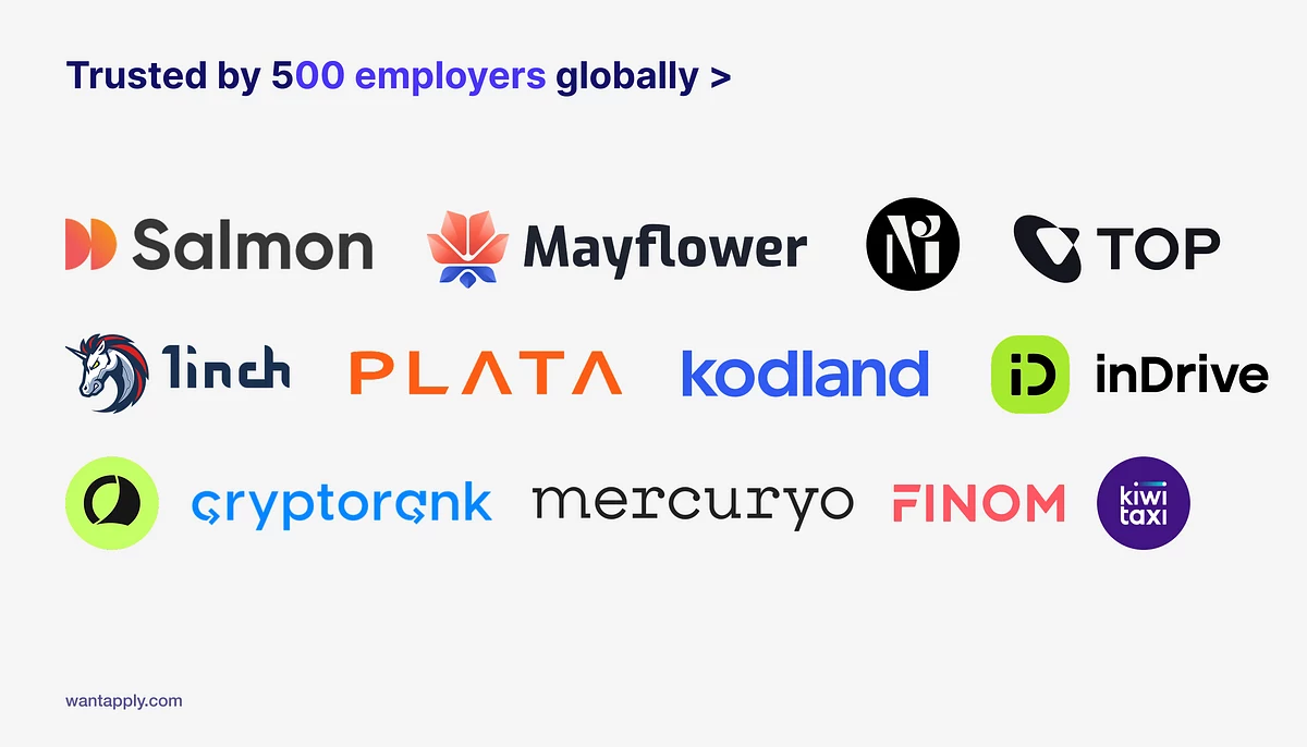 - Размещаем только проверенные компании вроде TradingView, Revolut, Plata Card, Salmon, Telegram Wallet, Searadar, Mayflower, Tangem. Сейчас у нас 450 верифицированных компаний, можно посмотреть здесь. Никаких скамов и «серых» вакансий под NDA. Мы связываемся с рекрутерами напрямую, плюс разрабатываем ATS интеграции для обменам данными об актуальности вакансий и автоматизации постинга.