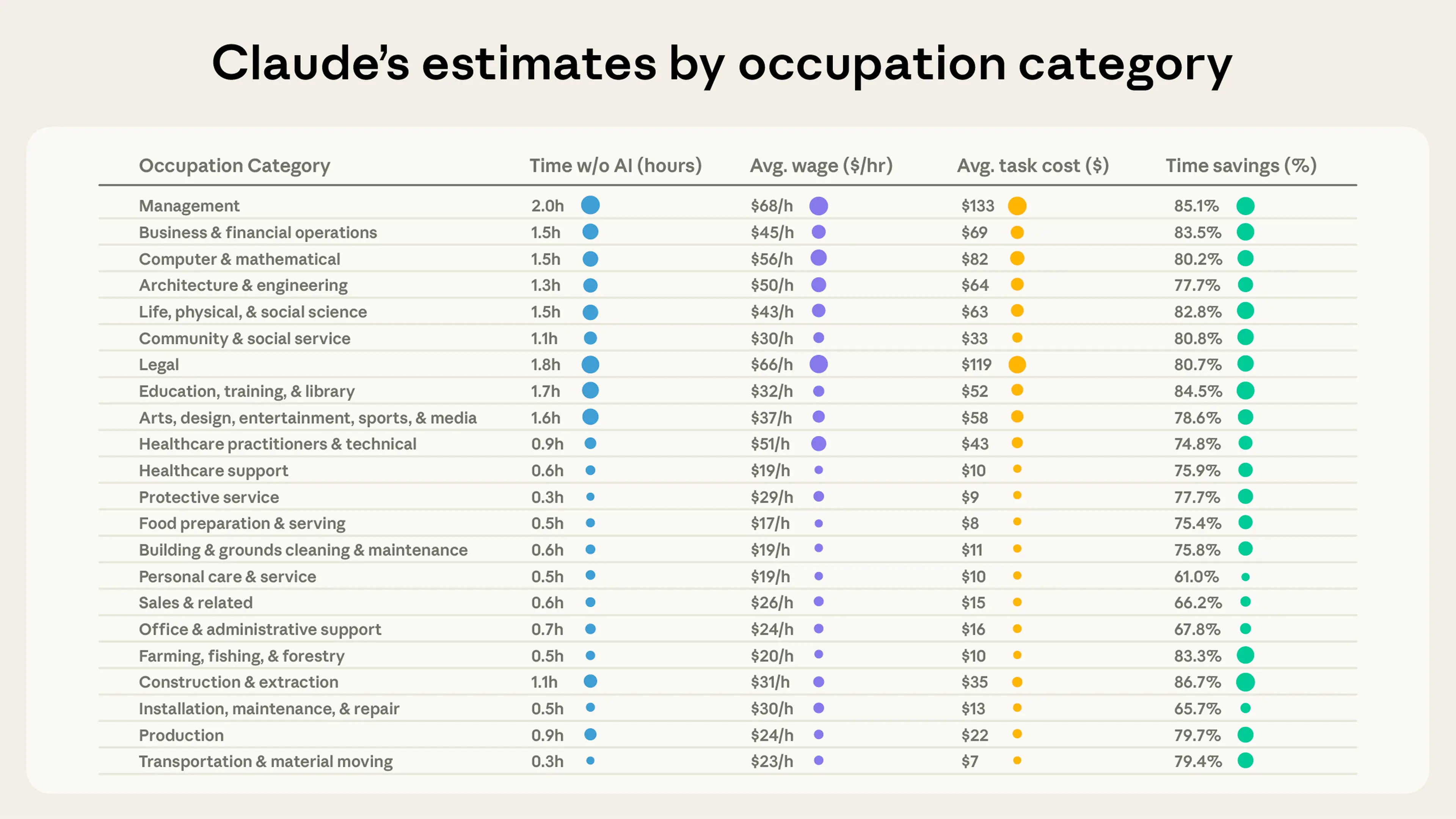 Anthropic проанализировала 100 тысяч реальных диалогов с Claude, чтобы оценить его влияние на производительность труда. По словам компании, задачи, на выполнение которых без ИИ уходит в среднем 90 минут, с ИИ занимают лишь 18 минут, то есть на 80%.