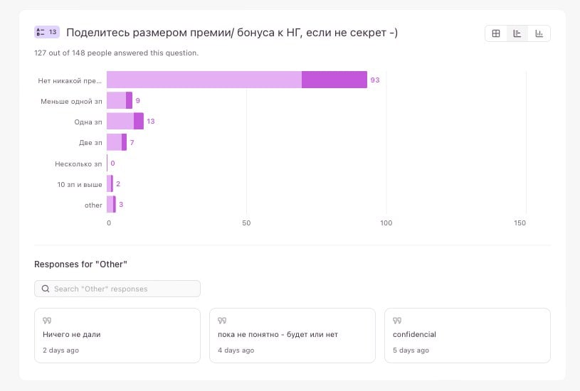 Два человека ответили, что им дали 10+ зарплат. Даже не знаем, верить им или нет. Скорее да: это лид из США и С-левел из Беларуси.