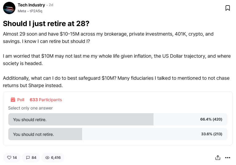 Айтишник из Meta поделился на Blind довольно нетипичной проблемой. К своим почти 29 годам он накопил около $10-15 млн в виде инвестиций, пенсионных отчислений, крипты и других сбережений.