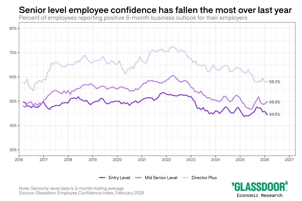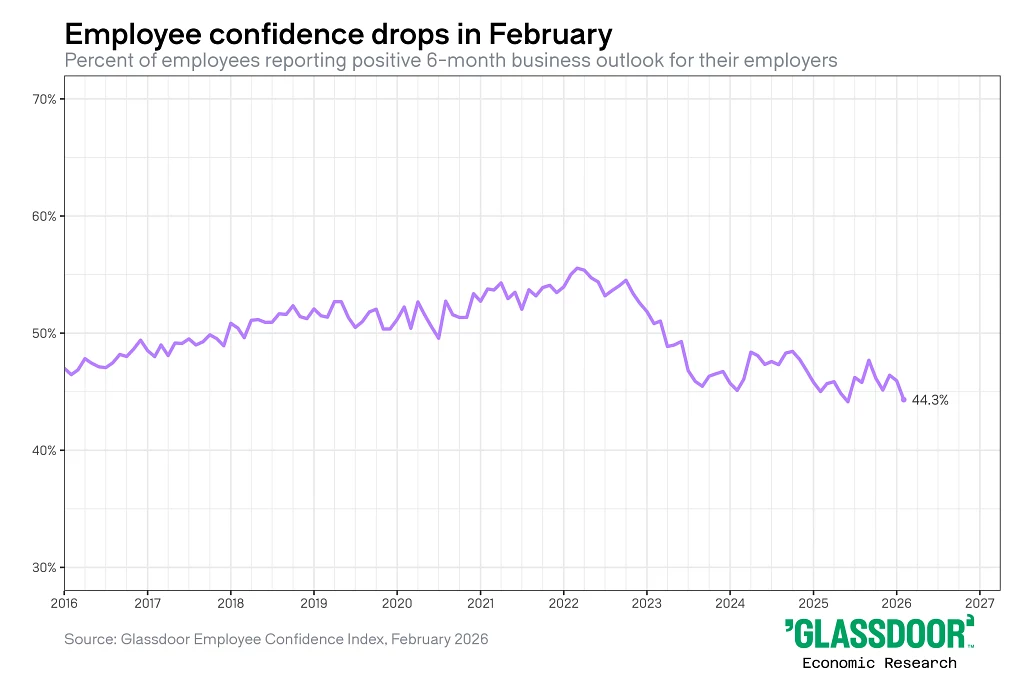 Доля сотрудников в США, позитивно оценивающих перспективы своих работодателей на ближайшие шесть месяцев, продолжает снижаться и в феврале 2026 года опустилась до 44,3% — одного из самых низких уровней за последние годы. Источник: Glassdoor.