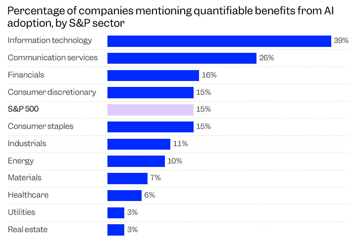 Чаще всего о пользе от ИИ, поддающейся количественному измерению, сообщали технологические компании — 39%. Это в 1,5 раза больше, чем было год назад — 26%. Следом идут коммуникационные услуги (26%) и финансы (16%). Среди энергетических компаний доля таковых выросла с 0 до 10%. Самый низкий показатель — в коммунальной сфере и недвижимости.