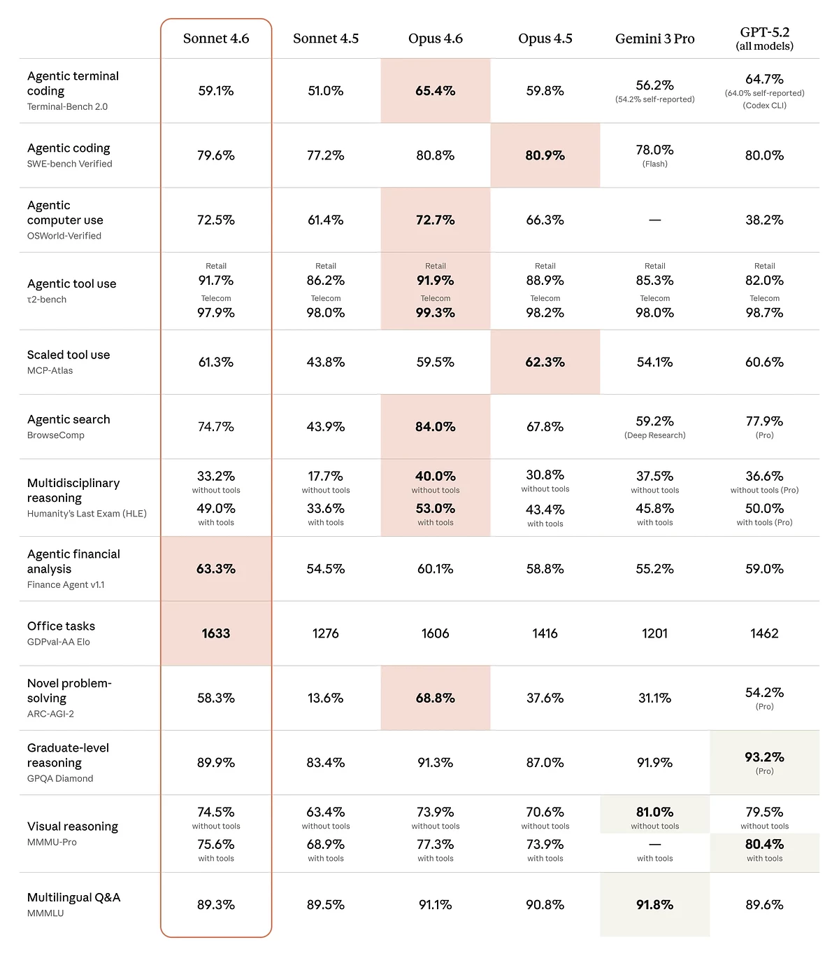 В бенчмарках Sonnet 4.6 показала рекордные результаты для своего класса. В тесте ARC-AGI-2, оценивающем способности, близкие к человеческому интеллекту, модель набрала 60,4%, обойдя большинство сопоставимых систем, хотя по-прежнему уступает более мощным моделям: Opus 4.6, Gemini 3 Deep Think и одной из версий GPT-5.2. В тестах SWE-Bench (инженерия ПО) и OSWorld (использование компьютера) также зафиксированы новые максимумы.