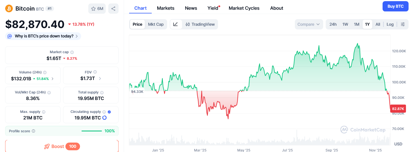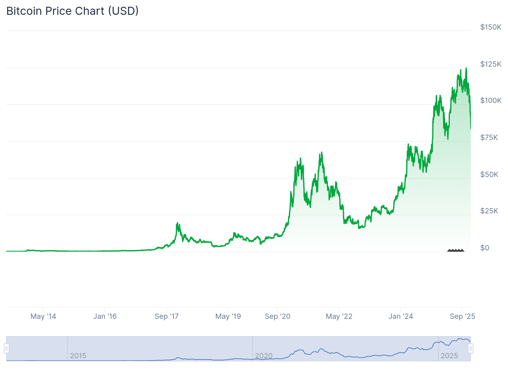 В начале октября биткоин установил исторический рекорд — курс перевалил за $124,7 тысячи. За последние полтора месяца он рухнул примерно на треть и на момент публикации составляет примерно $83 тысячи.