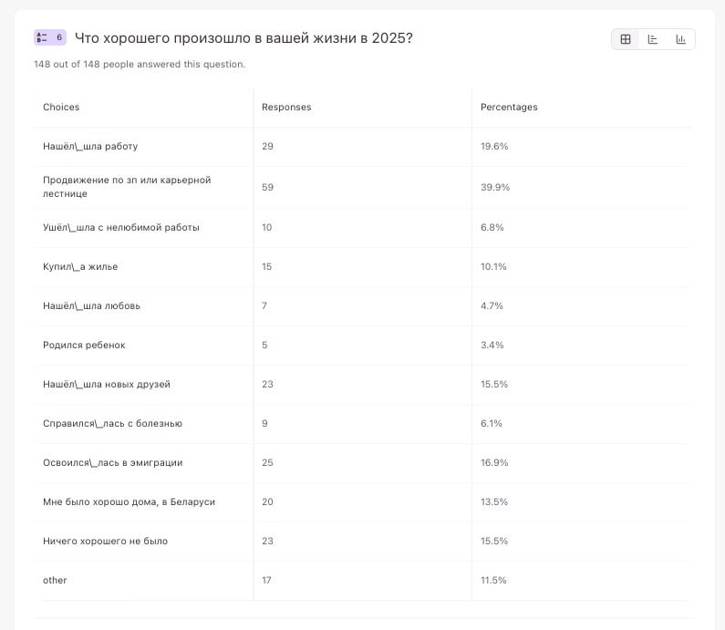 Уточнили у читателей, что хорошего произошло у них в 2025. Почти у 40% — продвижение по зарплате или карьерной лестнице, каждый пятый нашёл работу, каждый седьмой нашёл новых друзей или освоился в эмиграции, каждый девятый купил жилье (!). Есть и такие, что родил детей и/или нашёл любовь.