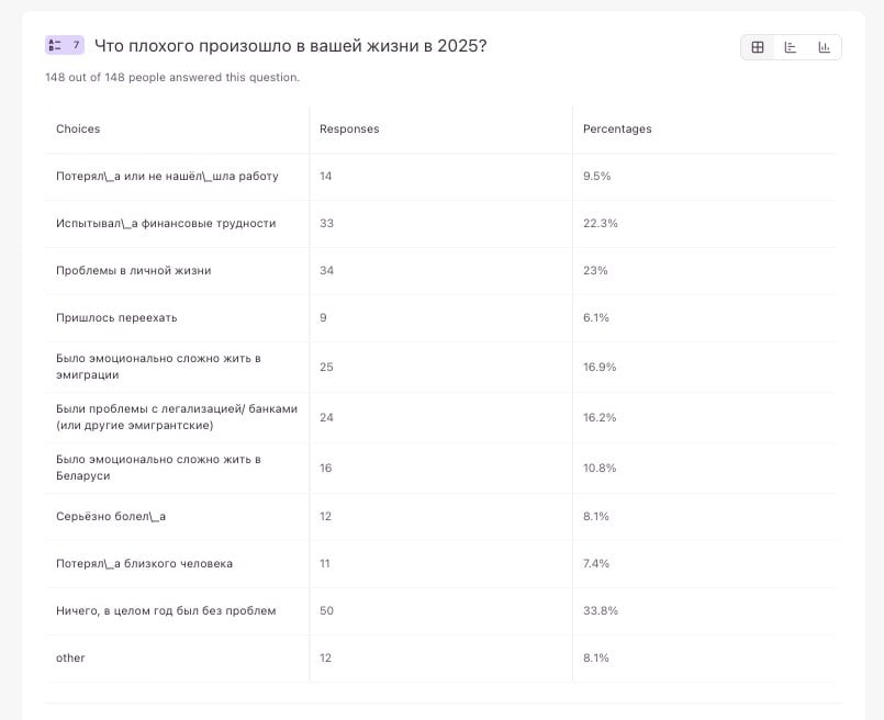 Почти у каждого четвёртого нехорошие события касались личной жизни, у каждого пятого были финансовые затруднения, чуть меньшее число боролось с плохими эмоциями в эмиграции, каждый десятый — с ними же в Беларуси. Каждый шестой испытывал трудности с легализацией или другой мигрантской рутиной.