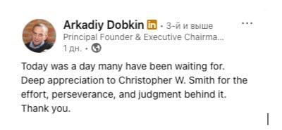 «Сегодня был день, которого многие ждали. Глубокая признательность Кристоферу У. Смиту за усилия, настойчивость и рассудительность, стоящую за этим. Спасибо», — написал Добкин в линкедин.