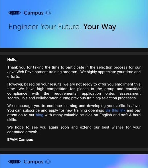 Также в EPAM предположили, что, возможно, кандидатка была overqualified для курсов и предложили написать на конкретный адрес с обещанием разобраться и дать подробный ответ.