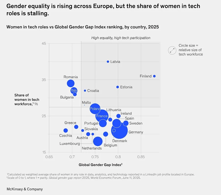 Больше всего женщин на технических должностях работает не в тех европейских странах, которые занимают самые высокие позиции в рейтинге гендерного равноправия от ВЭФ. Инфографика: McKinsey&Company