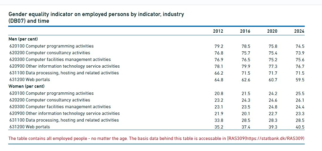 Статистическое управление Дании на своём сайте открыто публикует, помимо прочего, детальню информацию об изменениях ситуации с гендерным равенством в разных отраслях экономики. Судя по этим цифрам, доля женщин в датском ИТ медленно, но неуклонно растёт. Впрочем, есть и исключение: в области «Обработка данных, хостинг и сопутствуютщие виды деятельности» доля женщин с 2012 по 2014 год сократилась с 33,8 до 28,5%.