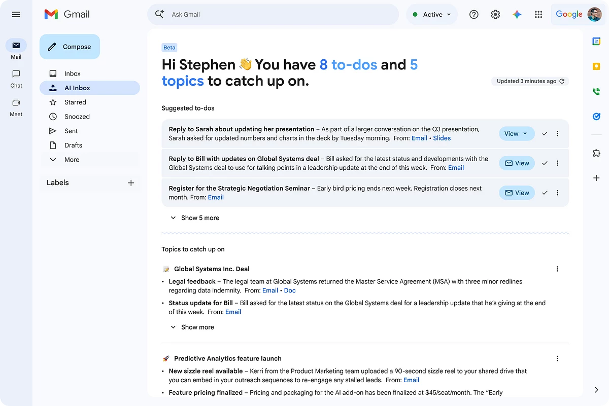 AI Overview будет собирать данные из нескольких писем и цепочек переписки и формировать общую сводку. В Google считают, что это будет полезно для поиска информации о проектах, счетах, поездках, встречах и комментариях к документам.