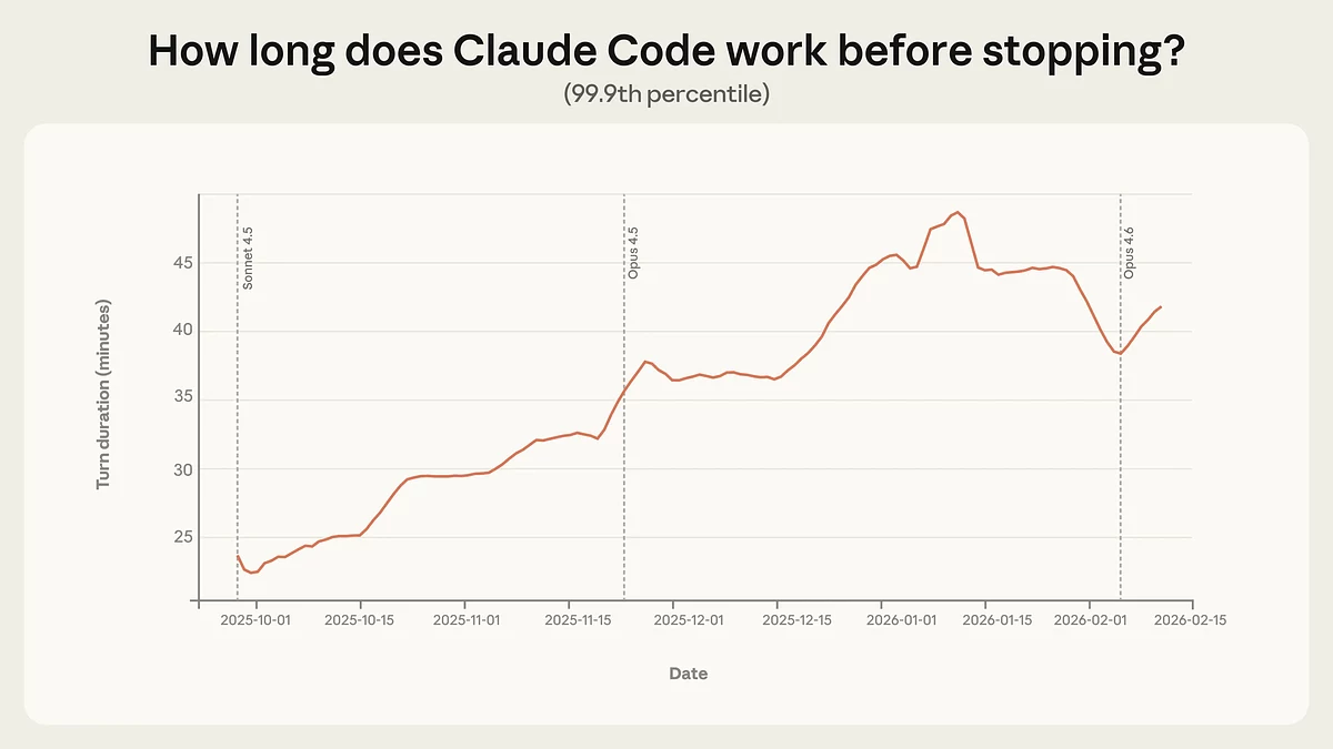 Claude Code стал работать дольше без вмешательства человека. Если раньше самые длинные сессии длились меньше 25 минут, то к январю 2026 года — уже больше 45 минут. Рост происходил постепенно, а не скачком после выхода новых версий модели. В Anthropic считают, что дело не только в улучшении ИИ, но и в том, что пользователи стали больше ему доверять и давать более сложные задачи. Позже максимальная длительность немного снизилась — вероятно, из-за притока новых пользователей и более коротких рабочих задач.