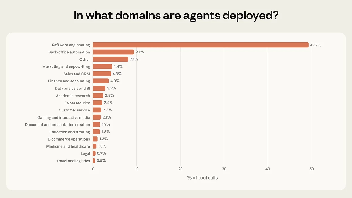 Распределение использования агентов по отраслям: почти 50% всех вызовов инструментов приходится на разработку ПО, тогда как остальные сферы — автоматизация бэк-офиса, маркетинг, продажи, финансы, аналитика, кибербезопасность и другие — занимают лишь небольшие доли, каждая менее 10%. Источник: Anthropic.