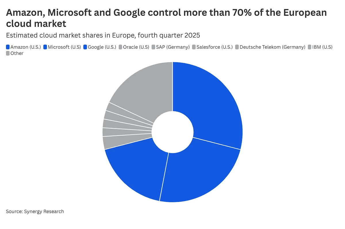 По данным Synergy Research Group и отчета Европейского парламента компании из США контролируют ключевые сегменты европейского ИТ-рынка — от облачных сервисов до корпоративного ПО и CRM-систем.