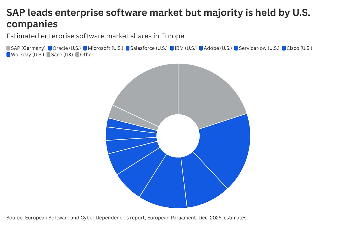 В сегменте корпоративного программного обеспечения SAP остается крупнейшим поставщиком в Европе, однако в целом не менее 59% рынка принадлежит американским компаниям. Oracle контролирует около 18%, Microsoft — около 10%. Эти данные приводятся в отчете Европарламента и охватывают весь европейский регион, включая Великобританию и Швейцарию.