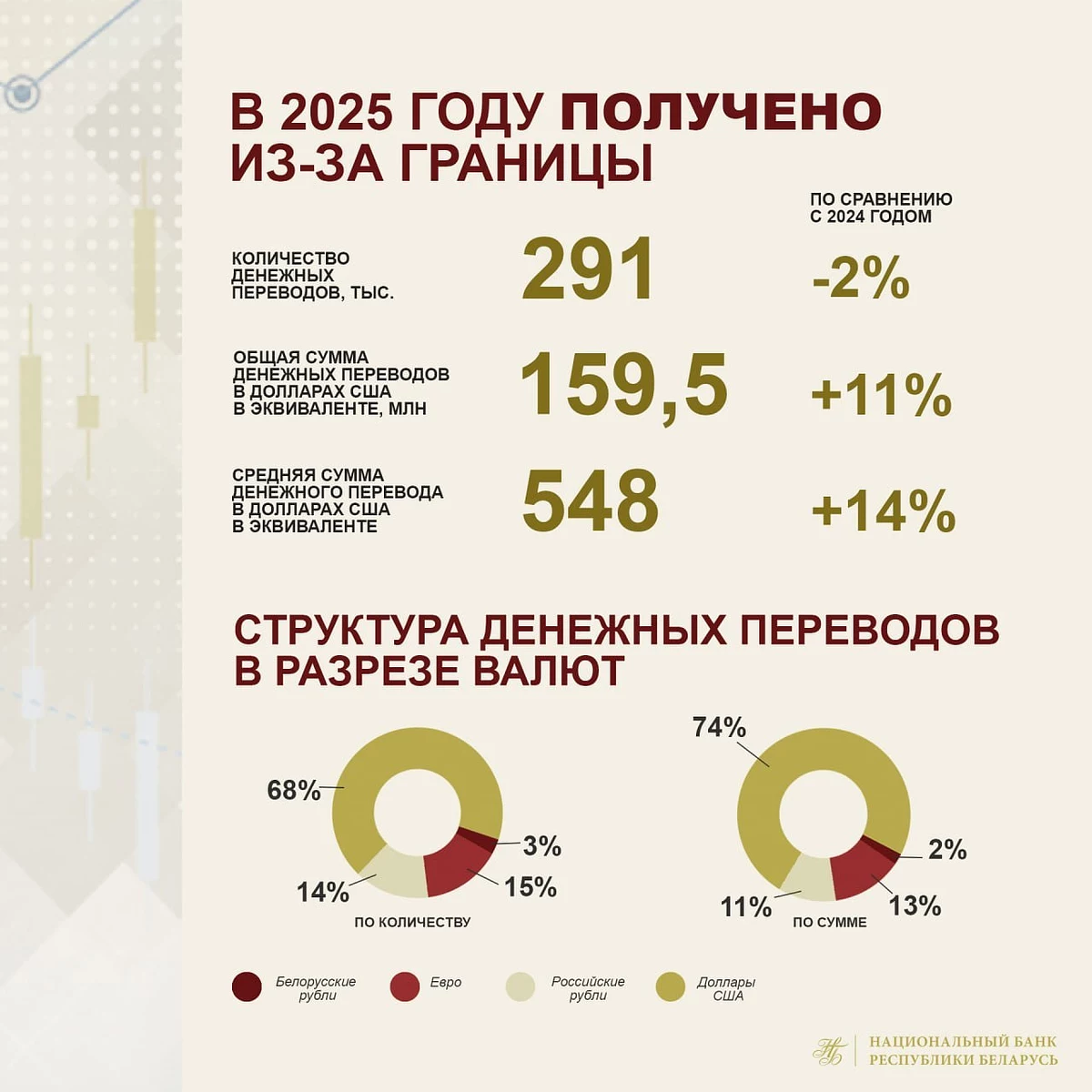 Объём полученных из-за рубежа переводов увеличился на 11% до $159,5 млн, а их количество упало на 2%. Средний размер перевода — $548. Причём 68% полученных переводов по количеству и 74% — по сумме были в долларах.