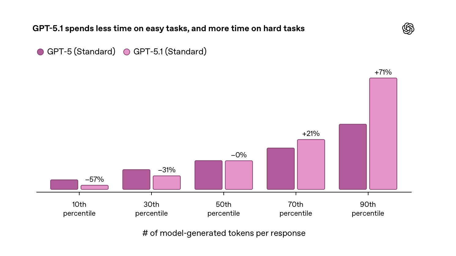 GPT-5.1 динамичнее распределяет время вычислений: на простых запросах модель сокращает объм генерируемых токенов до −57%, а на самых сложных — увеличивает до +71% по сравнению с GPT-5. Источник: OpenAI.