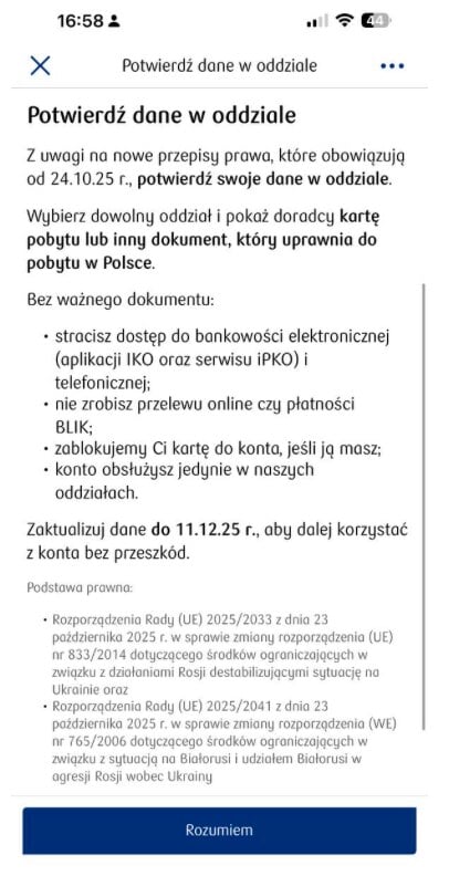 Вечером 2 декабря клиенты PKO массово стали получать уведомления от банка, в котором тот просит до 11 декабря принести в отделение ВНЖ или другой документ, подтверждающий легальное пребывание на территории Польши. В противном случае банк обещает заблокировать карты, BLIK, мобильный и интернет-банкинг, оставив возможность обслуживания только при личном обращении в банк.