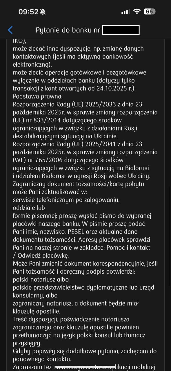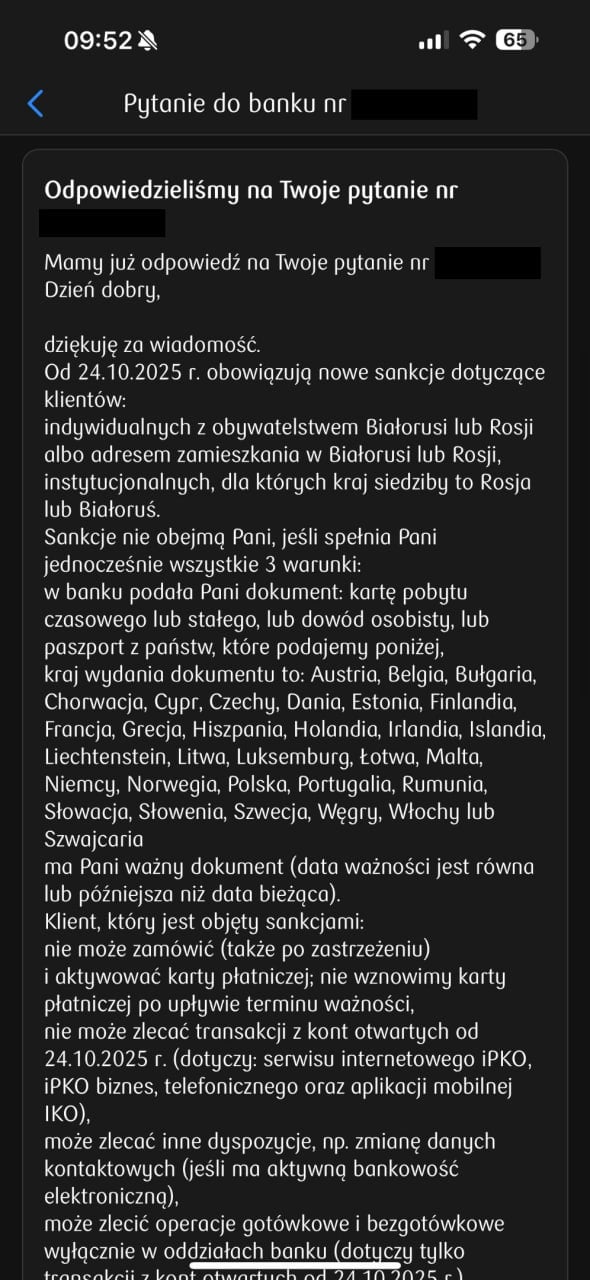 В распоряжении канала Złoty Dzik оказался официальный ответ банка PKO одному из клиентов, где говорится, что с 24 октября действуют санкции, которые касаются клиентов-физлиц из Беларуси и России с гражданством или физическим адресом проживания в этих странах. А также юрлиц, головной офис которых находится в двух странах.