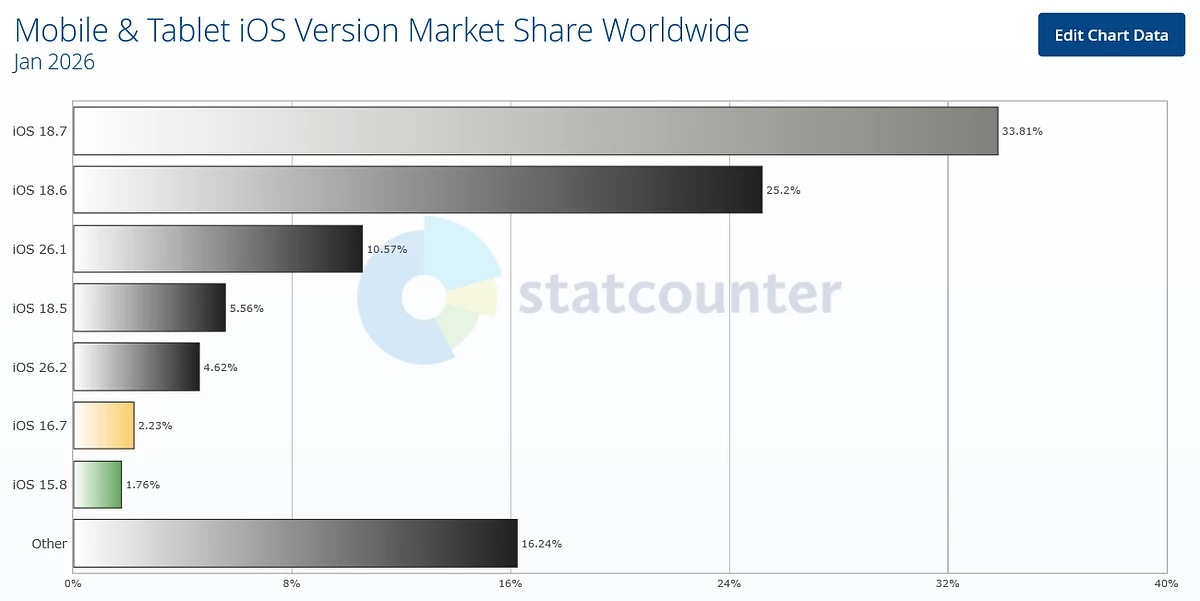 Самая свежая версия мобильной ОС Apple — iOS 26 — очень плохо приживается среди пользователей. По данным StatCounter на январь, под её управлением работает примерно 15-16% всех активных айфонов и айпадов в мире.