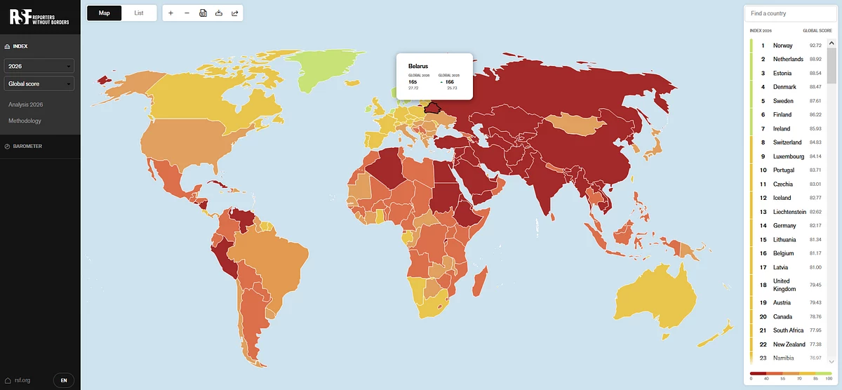 Лидирует в индексе уже 10 лет подряд Норвегия. Последнее место снова за Эритреей. В целом ухудшение ситуации зафиксировано в 100 из 180 стран, которые охватил рейтинг. Среди стран-соседок к Беларуси ближе всего Россия — на 172 месте. Литва на 15 месте, Латвия — на 17-м, Польша поднялась на 27 строчку, Украина переместилась с 62-й на 55-ю.