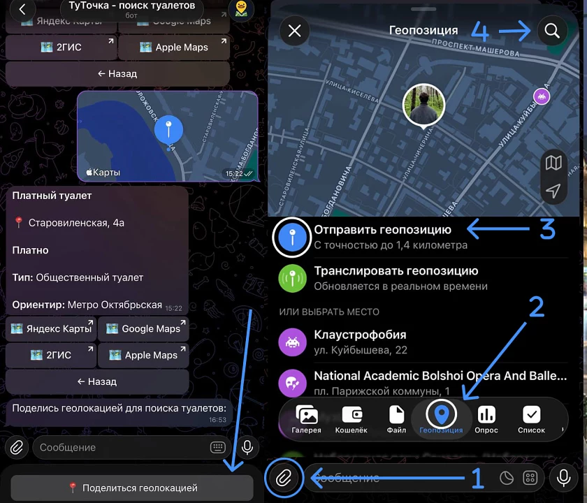 Достаточно перейти по ссылке, открыть Telegram-бот и отправить геолокацию. После этого бот сразу покажет список ближайших туалетов. Остаётся только выбрать подходящий вариант и открыть карточку с описанием и маршрутом в Яндекс Картах, 2ГИС, Google Maps или Apple Maps.