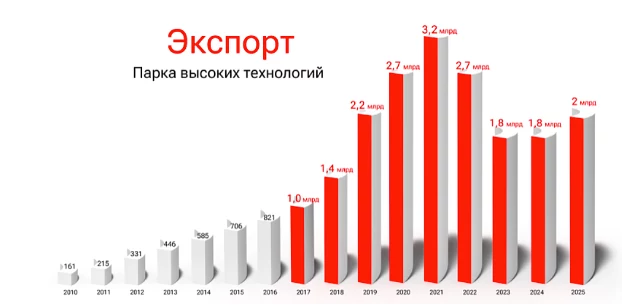 ПВТ обновил график экспорта своих резидентов. За 2025 год поступления от внешних продаж услуг выросли на 11%, с $1,8 миллиарда USD до $2 миллиардов.