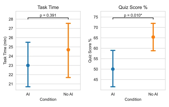 Обе группы выполняли одинаковые задачи, после чего проходили тест на понимание ключевых концепций. Разработчики с доступом к ИИ набрали в среднем на 17% меньше баллов, чем контрольная группа, при том что разница во времени выполнения заданий оказалась статистически незначительной.