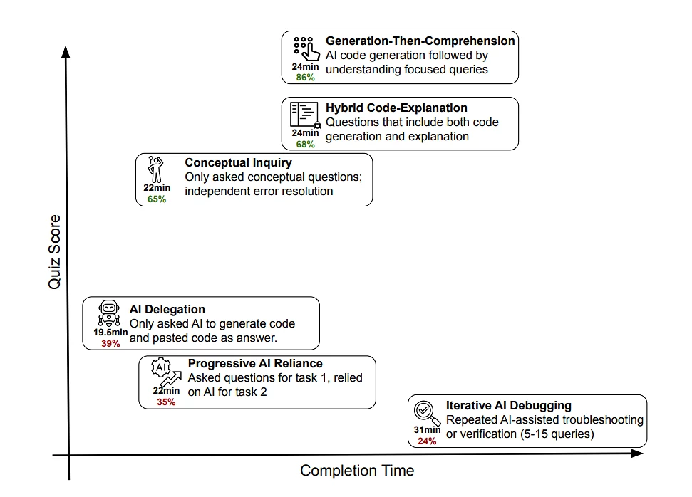 Наихудшие результаты показали участники, которые постоянно использовали ИИ для отладки, не пытаясь самостоятельно понять ошибки. В то же время разработчики, которые просили объяснения, задавали концептуальные вопросы или сначала генерировали код, а затем разбирались в нем, сохраняли высокий уровень понимания материала.