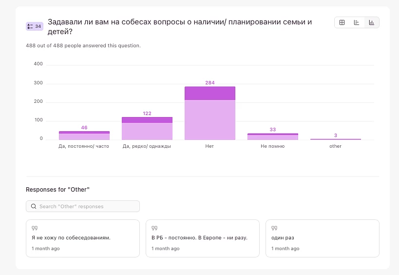В ответах на вопросы анкеты по несколько другим темам айтишницы не раз упоминали, что наниматели на интервью неоднократно спрашивали их о планах на замужество и детей. На прямой вопрос, было такое или нет, утвердительно ответили больше трети (34%). Причём каждую десятую о личных планах спрашивают постоянно.