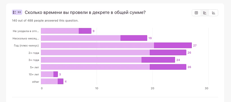 Почти каждая пятая айтишница-мама провела в декрете около года, каждая седьмая обошлась несколькими месяцами. В то же время больше половины мам (54%) находились в декретном отпуске от 2 до 10 лет, а единицы провели там 10+ лет.