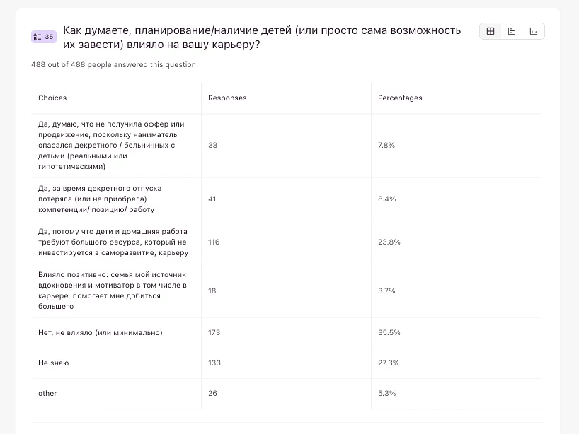 Каждая 12-я отмечает, что за время декрета потеряла/не приобрела рабочие компетенции или работу. А каждая 13-я — что не получила оффер или продвижение из-за страхов нанимателя, связанного с (в том числе гипотетическими) детьми.